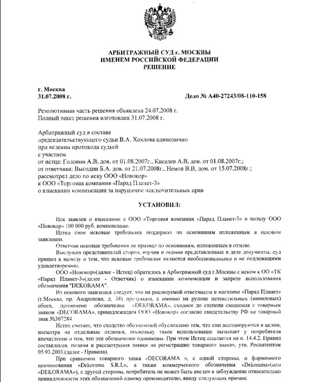 Решение Арбитражного Суда Москвы по делу А40-27243 о нарушении прав на товарный знак "Decorama"